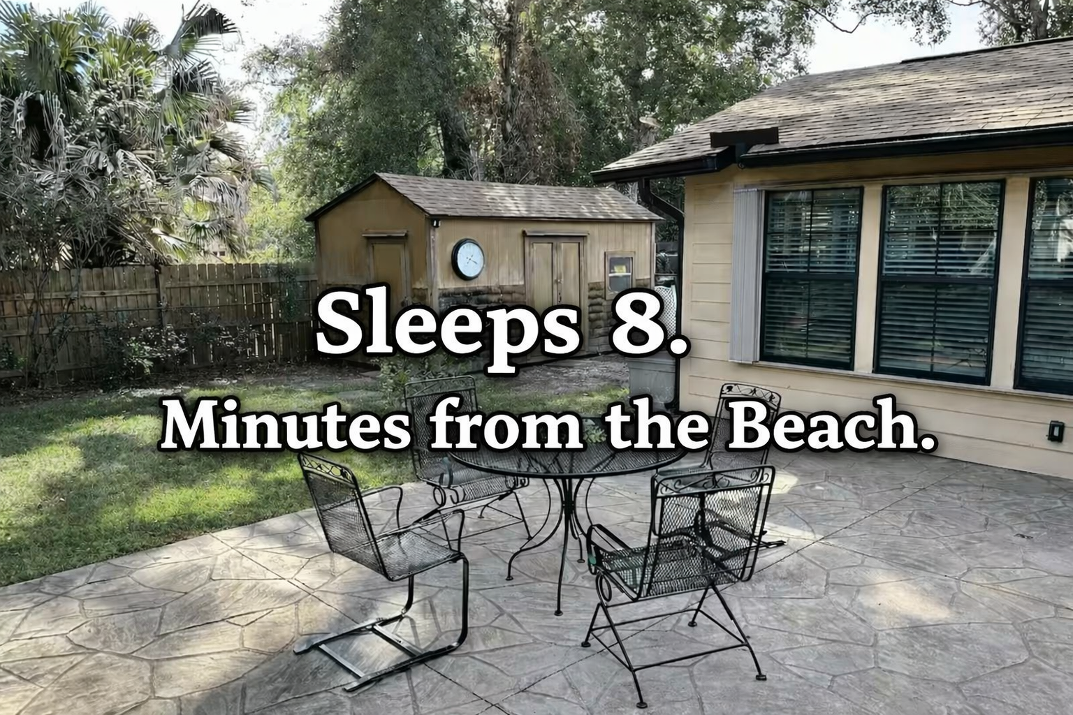 - Amenities: Air conditioning, BBQ outdoor, Beach Chairs, Board Games, Ceiling fans, Coffee service, Dining area, Dinnerware, Discounts for longer stays, Dishwasher, Dryer, Electric Range, Entire house, Exterior Security Camera(s), Fenced yard with gate, Fire Extinguisher, First aid kit, Fishing close by, Flat-screen smart TV's, Free parking, Free WiFi, Hair dryer, Hand soap, Hangers, Iron, Ironing Board, Keyless entry, Large yard, Microwave, Outdoor pool, Patio Dining Set with Umbrella, Pool, Private fenced yard, Refrigerator, Saltwater Swimming Pool, Smoke detector, Toaster, Towels, Vacuum, Washer