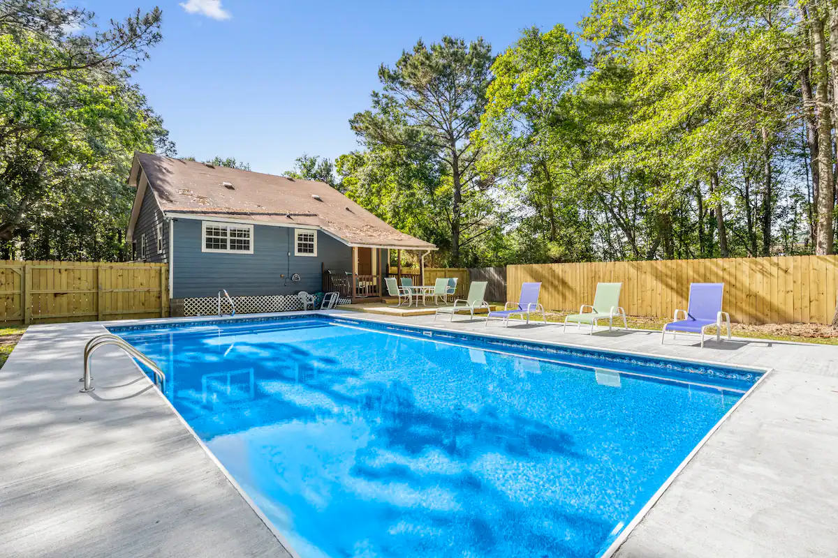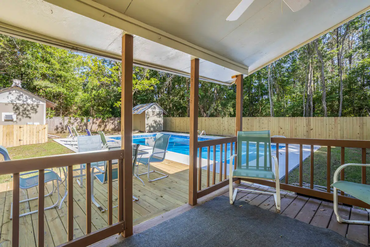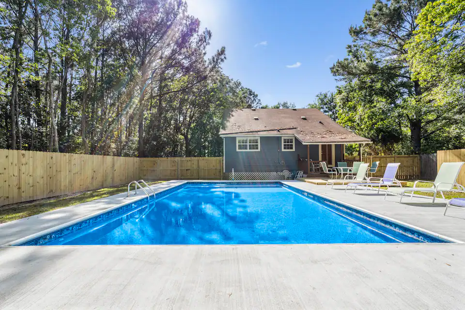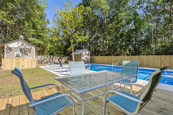 - Amenities: Air conditioning, BBQ outdoor, Beach Chairs, Board Games, Ceiling fans, Coffee service, Dining area, Dinnerware, Discounts for longer stays, Dishwasher, Dryer, Electric Range, Entire house, Exterior Security Camera(s), Fenced yard with gate, Fire Extinguisher, First aid kit, Fishing close by, Flat-screen smart TV's, Free parking, Free WiFi, Hair dryer, Hand soap, Hangers, Iron, Ironing Board, Keyless entry, Large yard, Microwave, Outdoor pool, Patio Dining Set with Umbrella, Pool, Private fenced yard, Refrigerator, Saltwater Swimming Pool, Smoke detector, Toaster, Towels, Vacuum, Washer