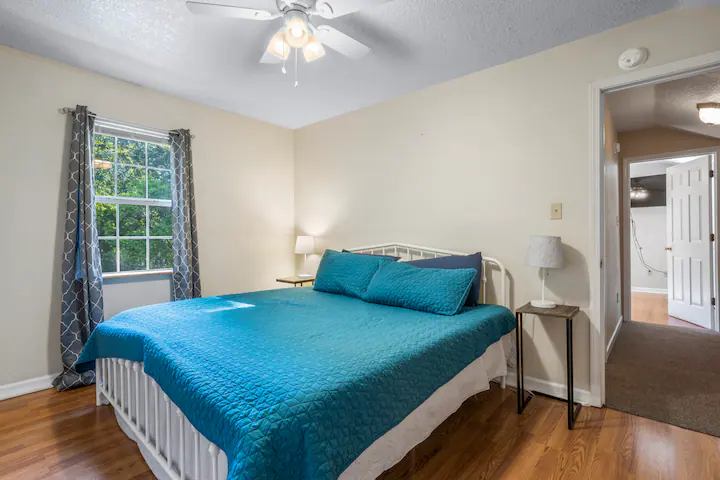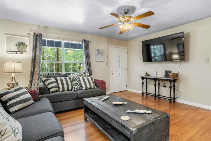 - Amenities: Air conditioning, Alexa, BBQ - outdoor gas, Coffee service, Dining area, Dryer, Entire house, Fire Extinguisher, Fire pit, First aid kit, Flat-screen smart TV's, Free parking, Free WiFi, Front porch with rocking chairs, Hair dryer, Hangers, Horseshoe Pit, Iron, Keyless entry, Kitchen, Large yard, Pet friendly, Private entrance, Shampoo, Smoke detector, USB charger station, Walk to restaurant(s), Washer