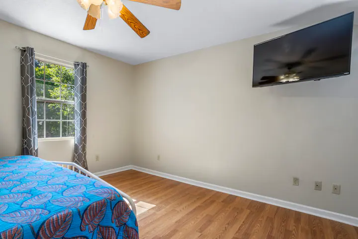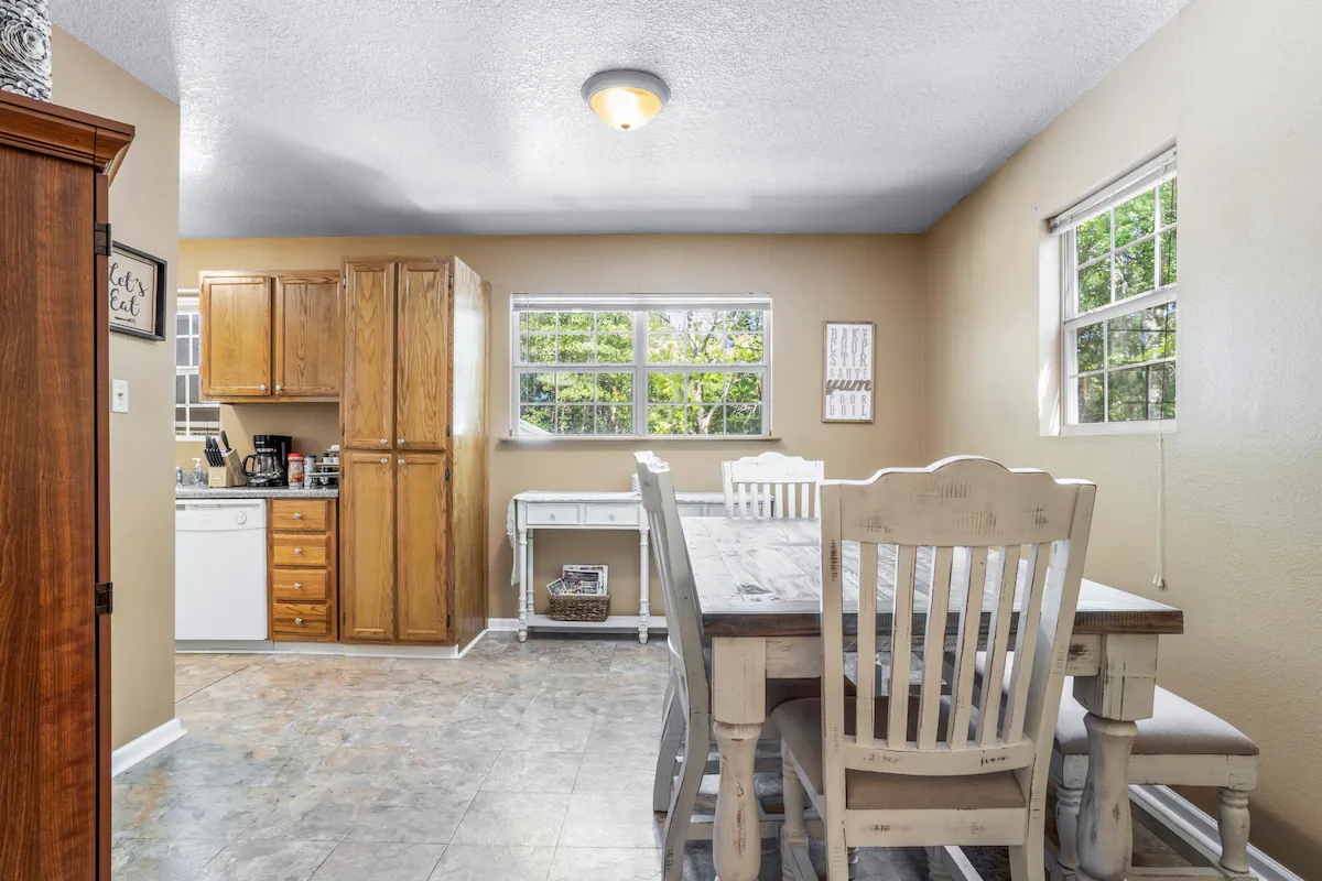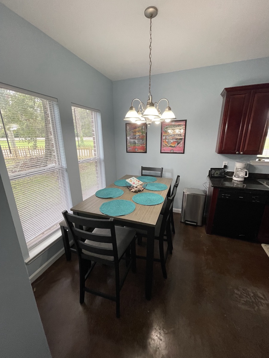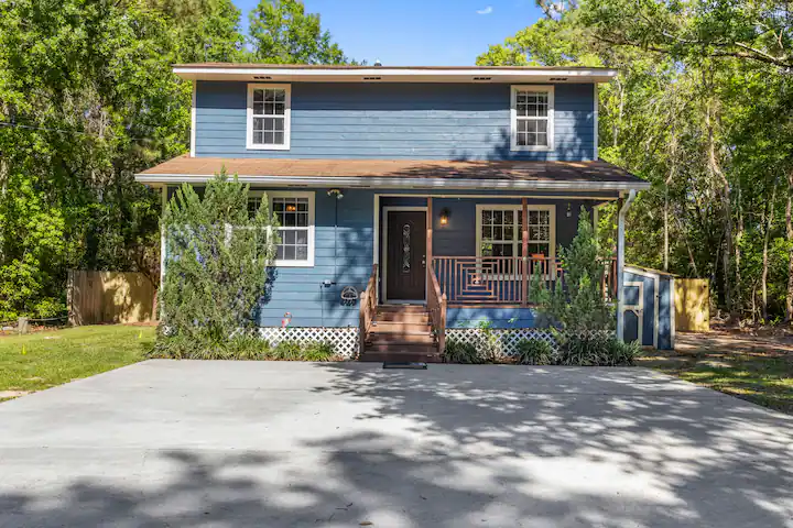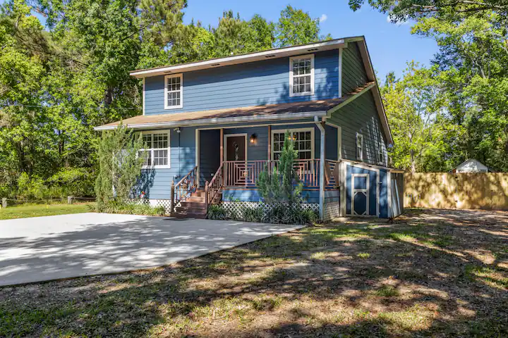 - Amenities: Air conditioning, BBQ outdoor, Coffee service, Dining area, Discounts for longer stays, Dryer, Entire house, Fenced yard with gate, Fire Extinguisher, First aid kit, Fishing close by, Flat-screen smart TV's, Free parking, Free WiFi, Hair dryer, Hangers, Iron, Keyless entry, Kitchen, Large yard, Private entrance, Smoke detector, USB charger station, Walk in Tub, Washer