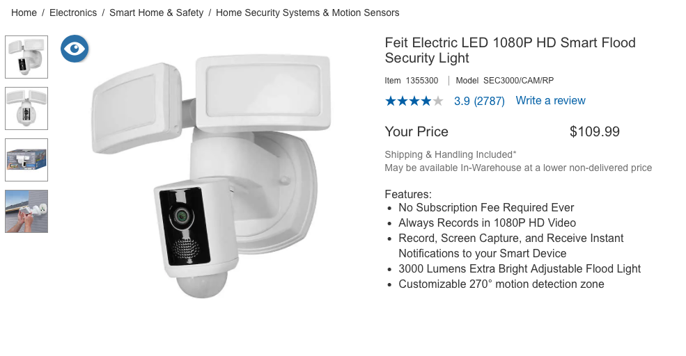 We recommend a security light made by Feit Electric. You can buy it at Costco or Amazon. The price in the picture is from Costco.